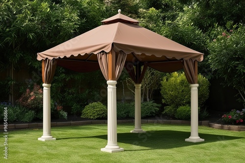 Vintage Brown Canopy Gazebo with Classic Pillars Perfect for Garden Settings and Outdoor Events