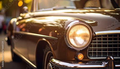 car, vintage, classic, retro, headlamp, chrome, polished, brown, sun, detail, close, front, smooth, elegant, sparkle, detail, beautiful, luxury