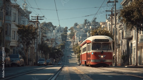 Vintage charm: San Francisco's iconic streetcar ascending a steep urban hill