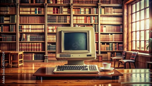 Vintage computer in classic library setting, evoking nostalgia and knowledge