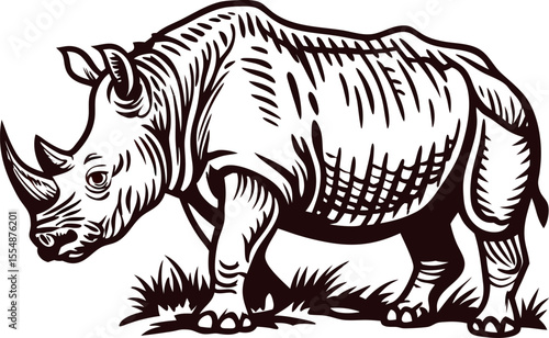 Vintage engraved black and white rhinoceros standing in grass illustration, hand drawn detailed animal sketch