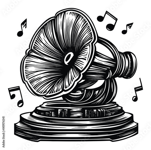 Vintage Engraving of a Classic Gramophone with Musical Notes