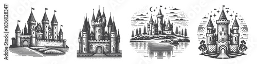 castle, fortress, tower, old building, stone wall, stronghold, mediaeval, gothic style, turret, gatehouse, fosse, battlement, historical site, fairy tale, magic, kingdom, enchanted, epic, legendary, ruin, knight, dragon, magician, ghost, skittish, mystery, adventure, old time, scenic, cloudy sky, logotype, design, vector, icon, symbol, illustration, creative, printing, engrave, hand-drawn, t-shirt, vintage, apparel
