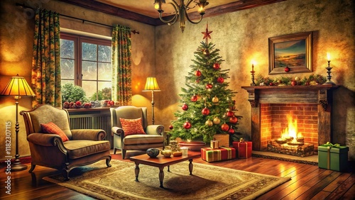 home interior, interior design, apartment, room, home, house, interior, decoration, christmas, holiday, vintage, cosy, festive, winter, rustic, retro, aged, 1950s, image, photograph, picture, illustration, background
