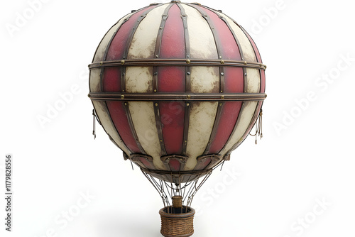hot, air, balloon, vintage, antique, airship, travel, adventure, flight, sky, cloud, red, white, brown, metal, fabric, texture, worn, aged, retro, classic, illustration, design, graphic, three-dimensional, rendering, transportation, elevation, height, journey, exploration, freedom, escape, fantasy