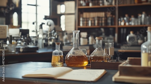 laboratory, vintage, glassware, book, chemistry, science, research, experiment, academe, study, beaker, flask, shelf, wooden, table, desk, equipment, setting, interior, old-fashioned, antique, retro, industrial, educational, cognition, learning, discovery, analysis, academic, scholarly, intellectual, scientific