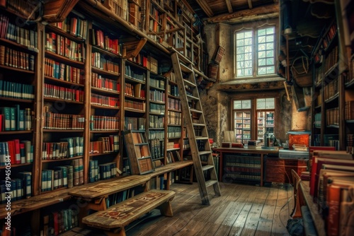 vintage, library, interior, bookshelf, old, book, shelf, bookcase, literature, education, antique, cognition, background, university, wood, collection, study, wisdom, retro, read, information, room, research, school, archive, ancient, classic, row, bookshop, culture, stack, design, college, science, inside, textbook, paper, learn, hardcover, cabinet, brown, architecture, historic, furniture, history, academic, generative, ai, illustration