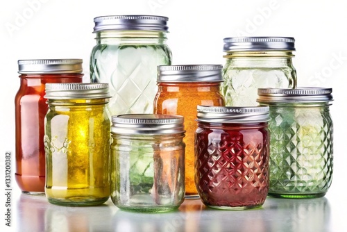 Vintage mason jars with metallic lids placed on a white backdrop, ideal for food preservation, DIY projects, or stylish home storage