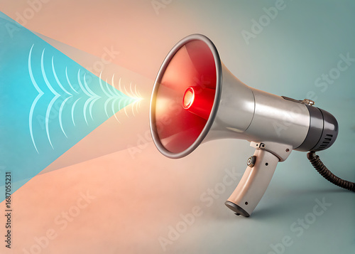 Vintage megaphone emitting sound waves on a textured background with warm and cool lighting