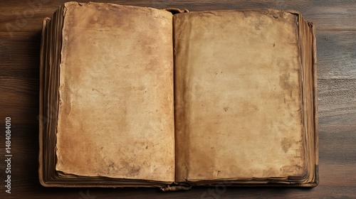 Vintage Open Book with Weathered Pages on Wooden Surface for Text Overlay
