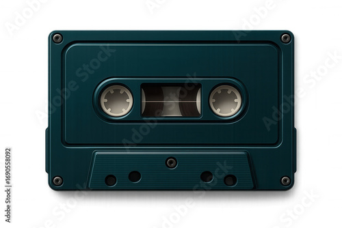 Vintage teal audio cassette tape close-up, embodying music nostalgia and retro technology against transparent backdrop