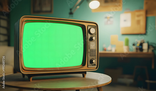 Vintage Television with Green Screen Display on Wooden Table design