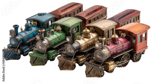 Vintage Trains: Classic vintage trains with steam engines and polished wooden carriages, isolated on a Transparent background, PNG file.
