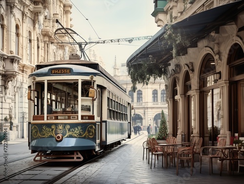 Vintage Tram Rolling Through Historic City Center - AI Generated