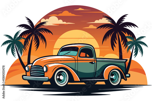 vintage, truck, tropical, sunset, vector, illustration, vibrant, retro, travel, poster, car, artwork, orange, green, palm, tree, aesthetic, nostalgic, transport, summer, adventure, graphic, design, stylish, landscape, silhouette, classic, beach, vacation, 60s, 70s, road, journey, colourful, vehicle, relaxing, ocean, sun, scenic, palm