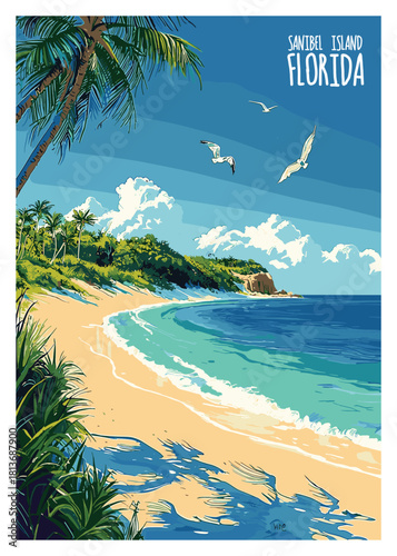 Vintage vector travel poster depicting a sunny tropical beach scene on Sanibel Island, Florida, with palm trees, seagulls, and turquoise waves.