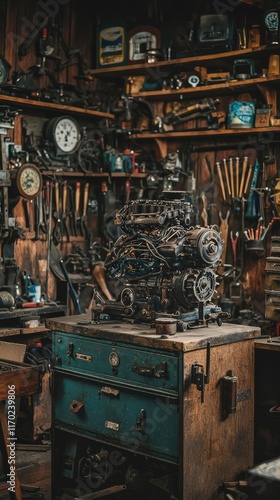 engine, workshop, tool, vintage, mechanic, wood, shelf, equipment, machinery, repair, steel, clock, cluttered, rustic, workbench, automotive, craftsmanship, storage, hardware, garage, cylinder, gear, assembly, art, manual, design, collection, industrial, home decor, dark, background, detail, manual labor, hand tool, functional, creative, history