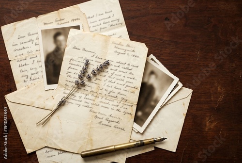 letter, vintage, wartime, correspondence, sepia, photograph, old, paper, aged, yellowed, nostalgia, history, memory, desk, wood, antique, writing, pen, brass, ink, heritage, archive, documentary, personal, intimate, communication, handwritten, creased, overhead, editorial, melancholic, past, sentimental, keepsake, family, heirloom, conflict, era, document, artifact, lavandula, dried, stationery