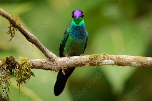 Violet-fronted Brilliant - Heliodoxa leadbeateri hummingbird in brilliants, tribe Heliantheini in Lesbiinae, found Bolivia, Colombia, Ecuador, Peru and Venezuela. Green bird with violet head