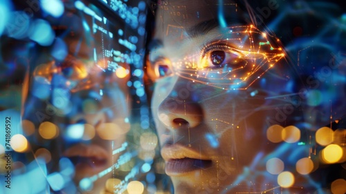 Visionary Technology Interface - A close-up of a woman's face with digital interface elements, symbolizing the integration of advanced technology with human senses.