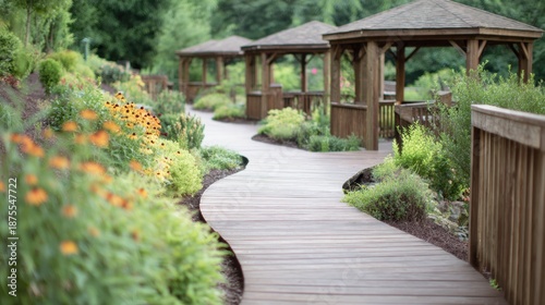 Visitors stroll along a curved wooden path surrounded by greenery and blooming flowers. Gazebos provide shaded spots along the way.