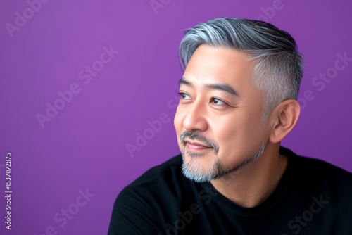Visual idea of style for aging men. A happy man in a studio photo. Purple solid background. Modish men's low fade haircut - midlife southeast asian man with middle hair.
