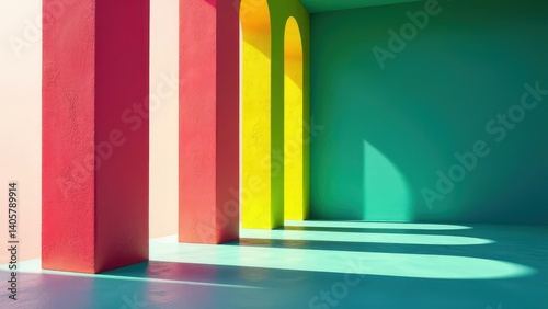 Vivid architectural space with colorful arches and sunlight patterns.