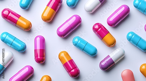 Vivid capsules rest on a white surface, showcasing the intersection of healthcare, pharmacy, and wellness.