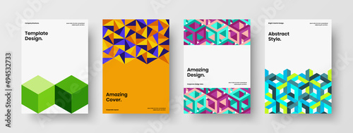 Vivid mosaic hexagons postcard template collection. Fresh corporate brochure A4 design vector layout set.