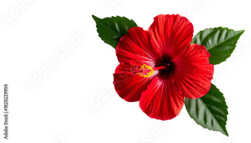 Vivid red hibiscus bloom with green leaves against a stark black background