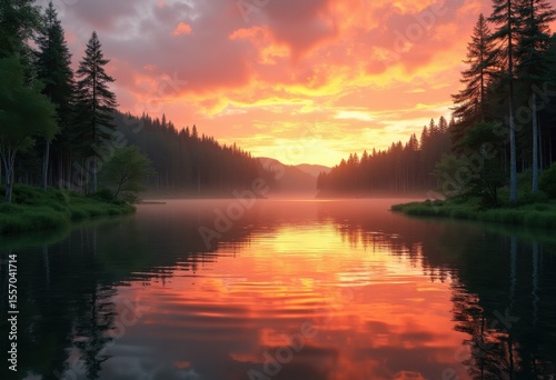 vivid sunset tranquil forest lake reflection peaceful nature scenic view orange sky, water, landscape, outdoors, vista, calm, trees, light, shimmer, colors