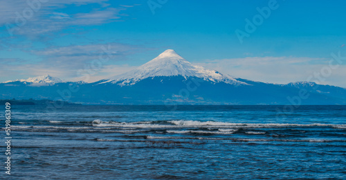 mountain, volcano, landscape, snow, lake, nature, sky, travel, beautiful, chile, cloud, water, mountain