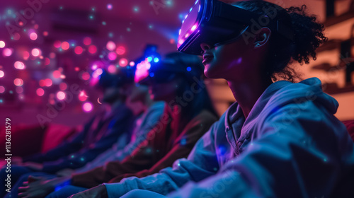 VR Goggles on a Group of People Watching a Visual Movie with Immersive Technology