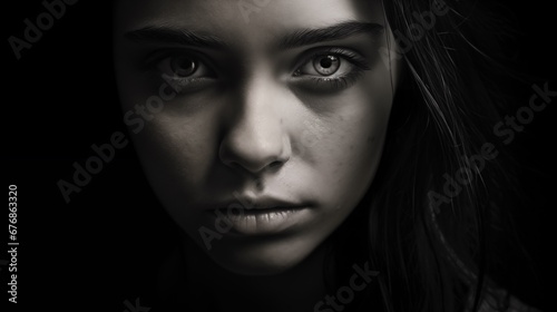 intense, closeup, teenage, look, natural, striking, monochromatic, hair, emotional, raw, vulnerable, authentic, deep, moody, contemplative, adolescence, realism, identity, confidence, individuality, pure, sincere, gentle, bold, real, presence, intimacy, insight, humanity, reality, black, white, grey, texture, detail, shadow, highlight