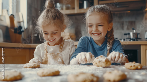 W przytulnej kuchni pełnej aromatu świeżo pieczonych ciasteczek, szczęśliwa rodzina z dwójką wesołych dzieci radośnie spędza czas razem.