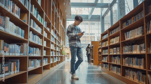Walking in library with phone for university, education, or college website, internet search, academy FAQ, about us, or contact. Campus, phone, and teen reading scholarship newsletter