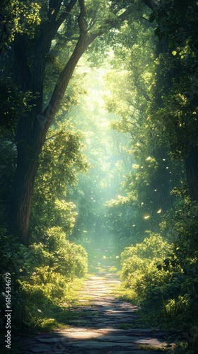 path, walking, stone, forest, sunlight, green, tree, leaf, tree branch, bush, plant, nature, foliage, environment, wood, day, light, sunbeam, sun ray, sunshine, mist, fog, clearing, passage, shadow, calm, tranquil, serene, peaceful, scenic, landscape, road, way, travel, tour tourism, recreation, escape, exploration, growth, summer, spring, atmosphere, pathway, background, fantasy, journey, discovery