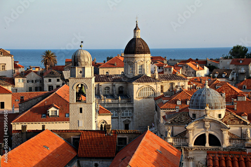 dubrovnik, croatia, wall, walking, historic, travel, city, europa, dalmatia, coast, unesco, architecture, mediaeval, tour tourism, sea, adriatic, church, town, old, prague, cathedral, roof, tower, view, building, panorama, city landscape, landscape, house, lisboa, red, sky