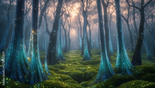 forest, walking, moss, light, tree, standing, sparkling, illuminating, ambient, trunk, growing, surreal, fantasy, nature, landscape, foliage, vegetation, environment, timberland, path, leading, ground, covering, texture, pattern, dreamlike, scenic, tranquil, peaceful, calm, quiet, morning, daylight, glow, aethereal, mystical, artistic, background