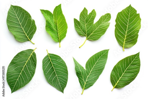 Walnut leaves collection. Leaves top view isolated. Green walnut leaf on white background. Flat lay leaf with clipping path. Full depth of field. Perfect not AI walnut leaf, true photo, ai