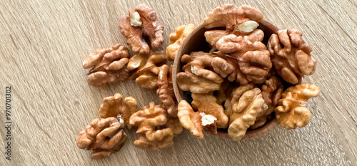 Walnuts kernels on dark desk with color background, Whole walnut in wood vintage bowl.