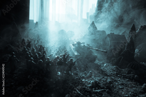 War Concept. Military silhouettes fighting scene on war fog sky background, World War Soldiers Silhouettes Below Cloudy Skyline. Armored vehicles. Tanks battle. Decoration