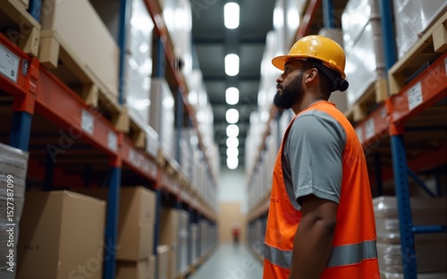 Warehouse employee observing inventory shelves attentively. High quality