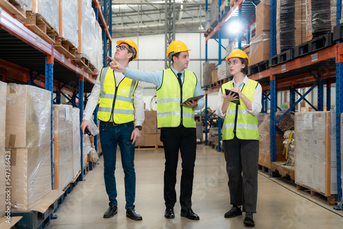 Warehouse team discussing while walking in warehouse