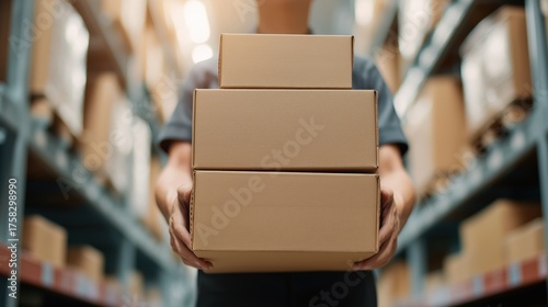 warehouse, men at work, holding, cardboard, box, storage, shelf, background, package, package, blurred, logistic, distribution, shipping, delivery, supply, chain, industrial, environment, clean, transportation, inventory, stock, parcel, courier, warehouseman, fulfillment, commerce, business, good, product, factory, interior, cardboard box, stack, uniform, work, depot, organisation, logistic, transport