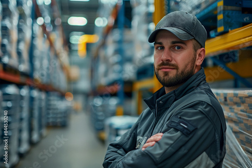 Warehouse worker, professional delivering cargo, man in uniform at industrial site