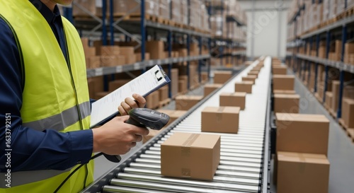 Warehouse Worker Scanning Packages on Conveyor Belt