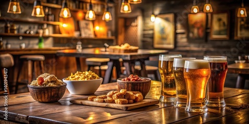 Warm and intimate pub atmosphere with a rustic wooden table, filled with beer glasses and snacks, and a chalkboard sign highlighting the night's quiz questions, dim lighting, snacks and drinks