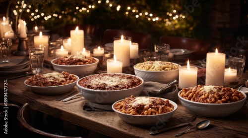 Warm and Inviting Dinner Setting with Delicious Pasta Dishes and Soft Candlelight Ambiance for Family Gathering or Special Celebration
