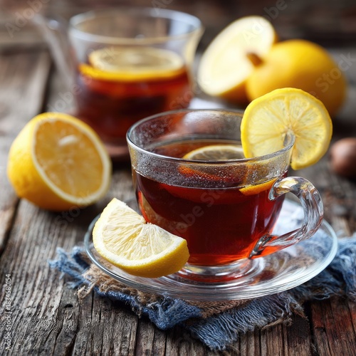 Warm Black Tea with Lemon in Glass on Rustic Wooden Table